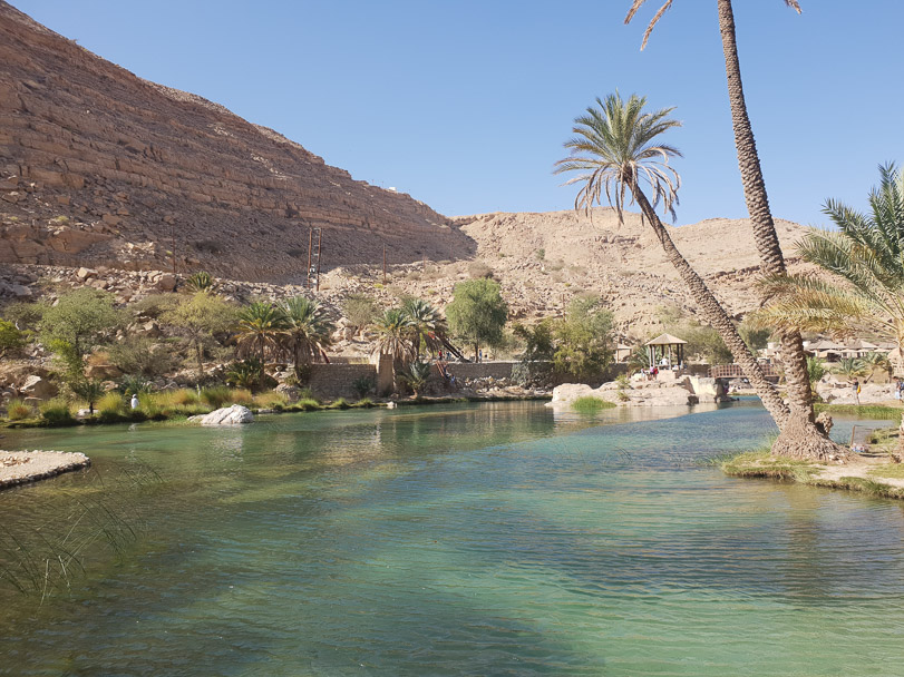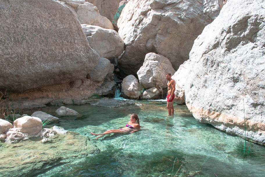 The walk takes about 30 minutes. It’s a really beautiful walk among palm trees and cliffs and across small rocks. It then opens up to the beautiful rock pools where you can walk up along the cliffs for a nice view overlooking the Wadi pools.